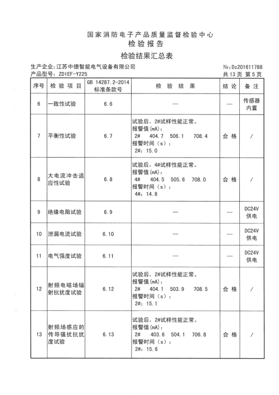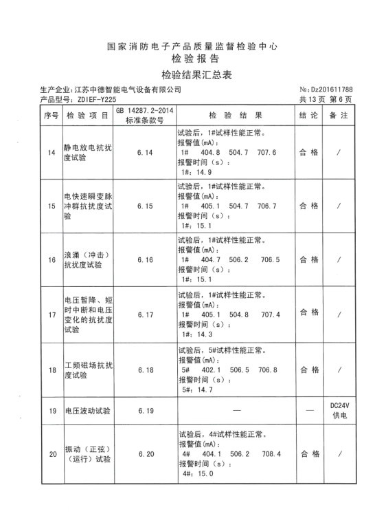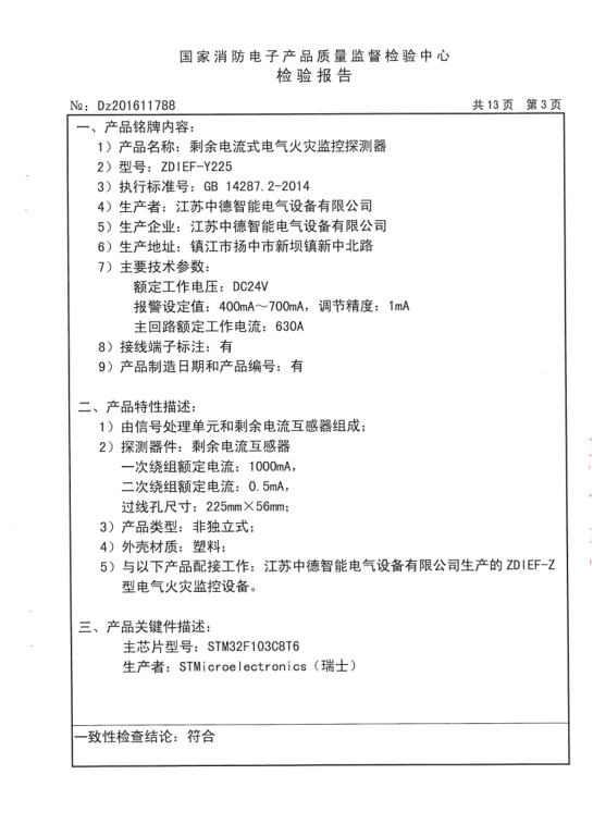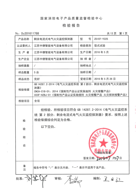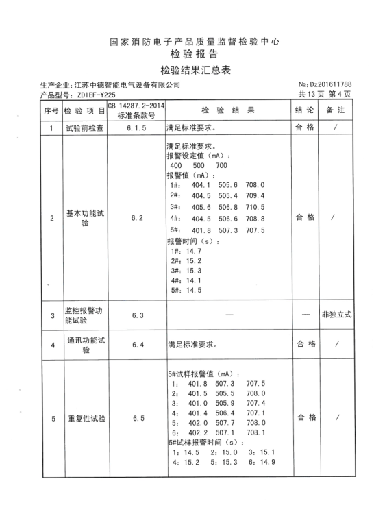 【ZDIEF-Y225型剩余电流式电气火灾监控探测器检验报告】201611788